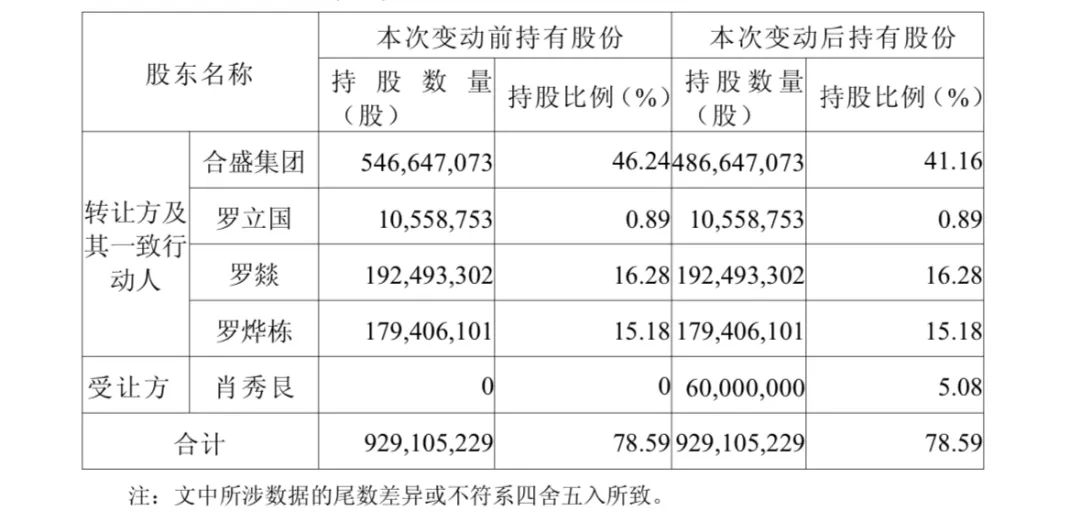 上述交易前,合盛集团及其一致行动人罗立国、罗燚、罗烨栋合计直接持有合盛硅业78.59%的股份,交易完成后持股比例将降至73.51%。