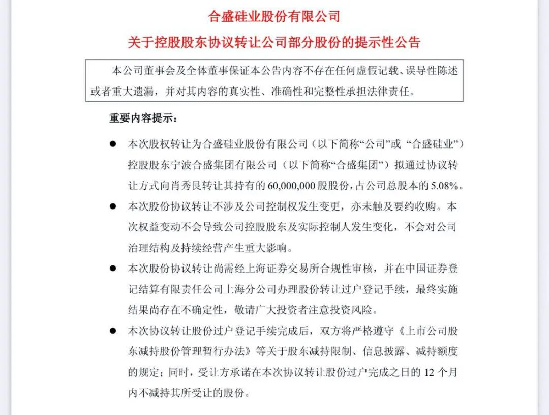 7月16日晚间,合盛硅业公告称,公司控股股东宁波合盛集团有限公司(以下简称合盛集团)拟以总价26.34亿元,向肖秀艮协议转让5.08%的公司股份。