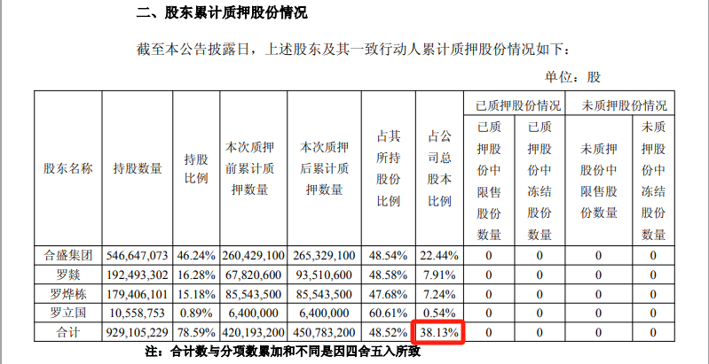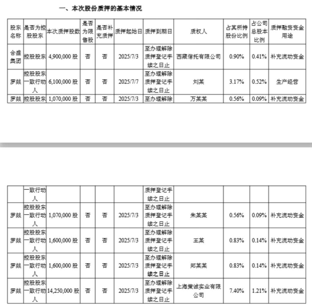 7月3日,合盛集团及其一致行动人罗燚再次质押部分股份。公告显示,截至当日,合盛集团及其一致行动人罗立国、罗燚、罗烨栋,累计质押所持合盛硅业的股份数量达4.51亿股,占其所持合盛硅业股份总数的48.52%,占合盛硅业总股本的38.13%。