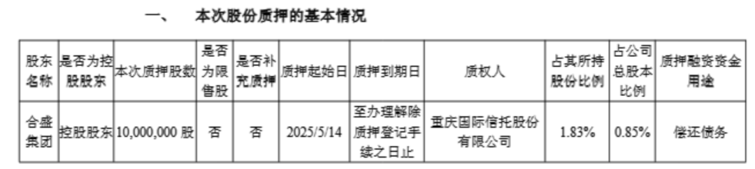 5月16日,合盛集团质押持有的合盛硅业部分股股份,融资用途为偿还债务。